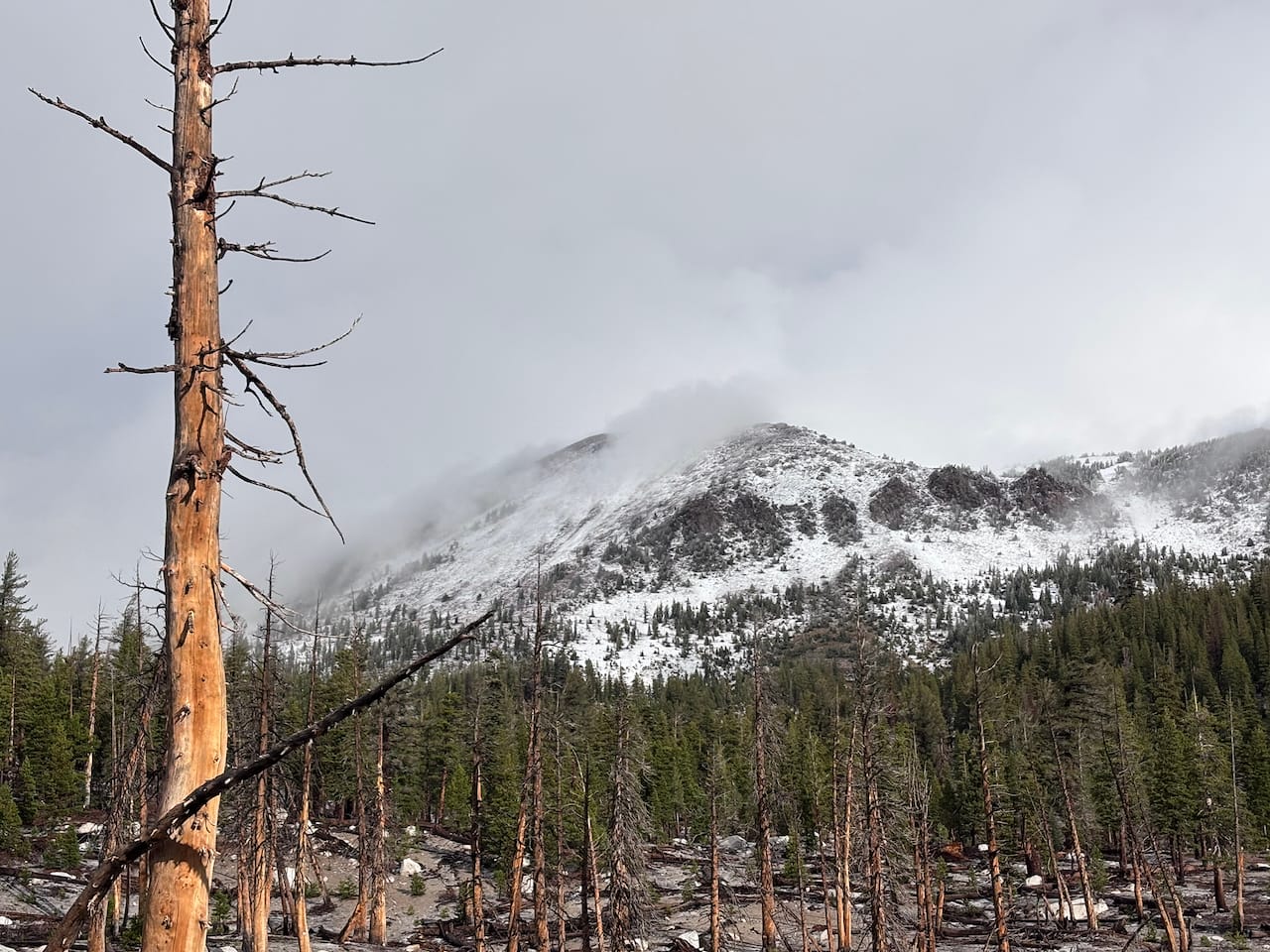 In 1989 a series of small earthquakes hit this region and disturbed a gas reservoir. Extremely high levels of carbon dioxide were pushed out through the volcanic vents surrounding the lake (nearby Mammoth Mountain is a volcano) and wiped out about 120 acres of trees and vegetation.