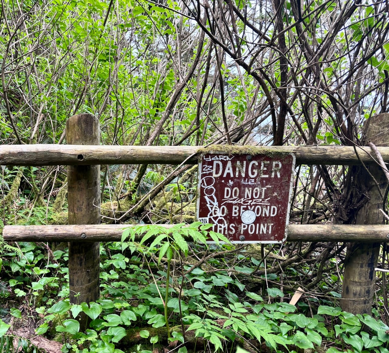 Nature has other qualities besides nonstop beauty, though. Namely, destruction. After another half-mile, the trail comes to an unplanned dead end. It is barricaded with a danger sign. I lean over it and look for the "why" and it certainly looks dangerous.