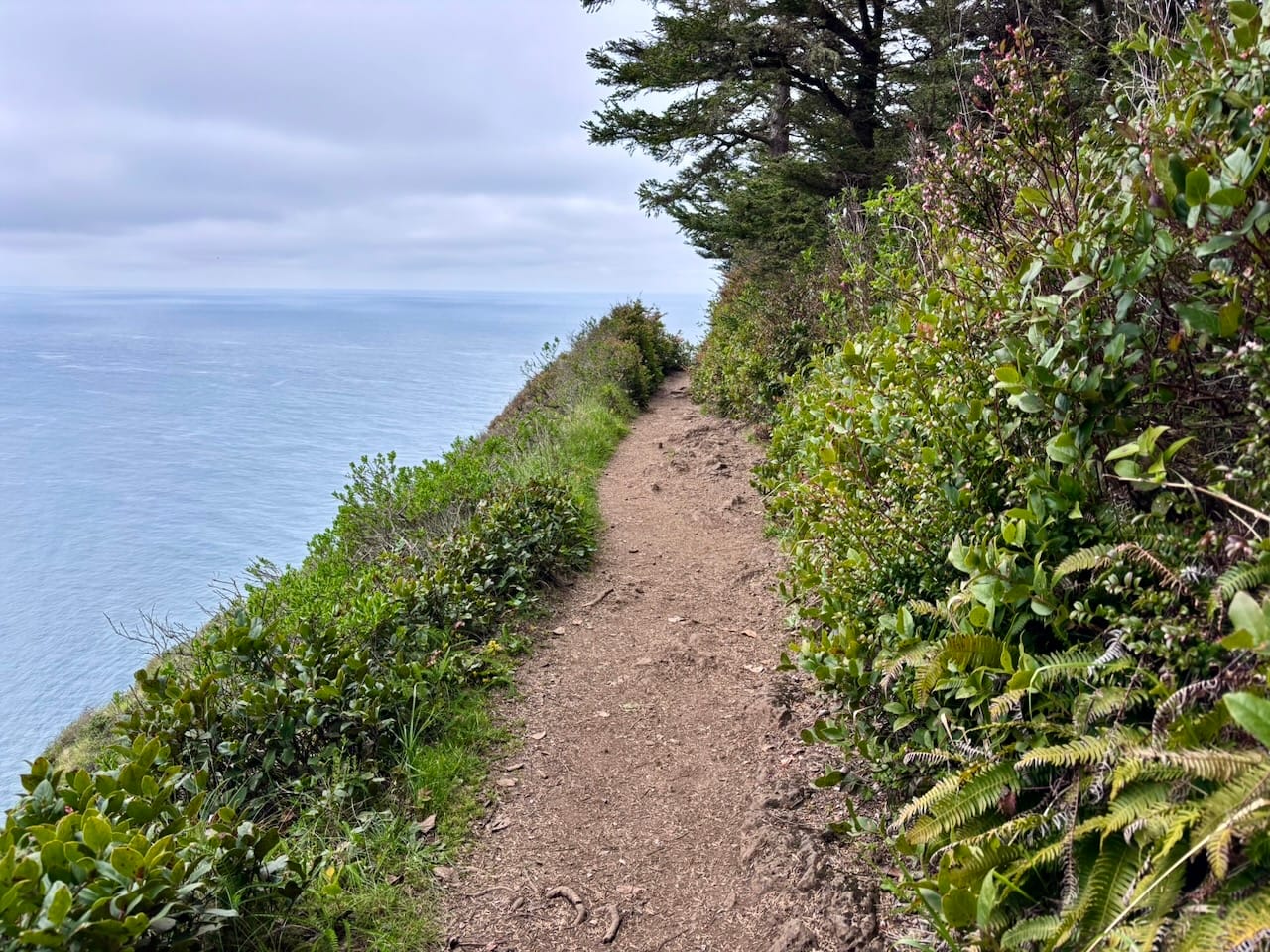 The Cape lookout trail is deceptive. The first half is a wide, gentle trail with smooth grading. Then the second half turns into a roller coaster, traversing up and down, over and through tree roots and mud. And several spots where there is some serious exposure to the cliffside and the vastness of the ocean about 1000 feet below.