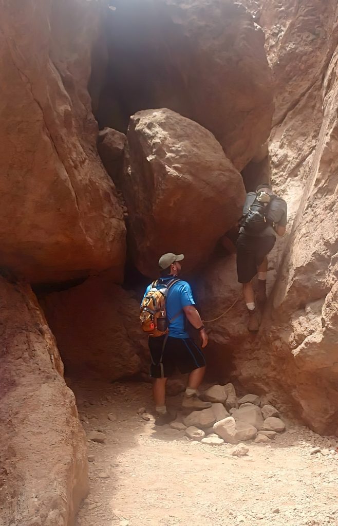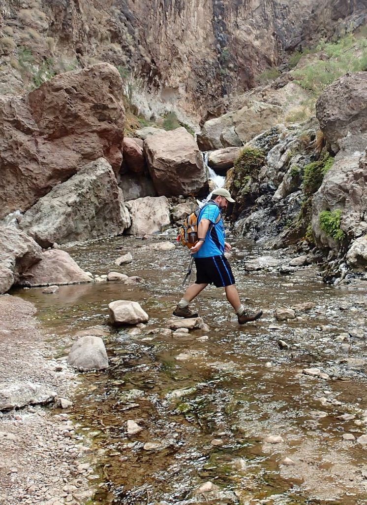 The Goldstrike Canyon trailhead is located about 5 miles outside of Boulder City, Nevada, along Highway 93 as you’re heading toward Hoover Dam. I knew from studying the trail notes in my newly acquired guidebook that it would involve ropes and downclimbs over slippery boulders, but I squelched the anxiety and trudged forward.
